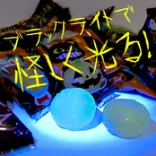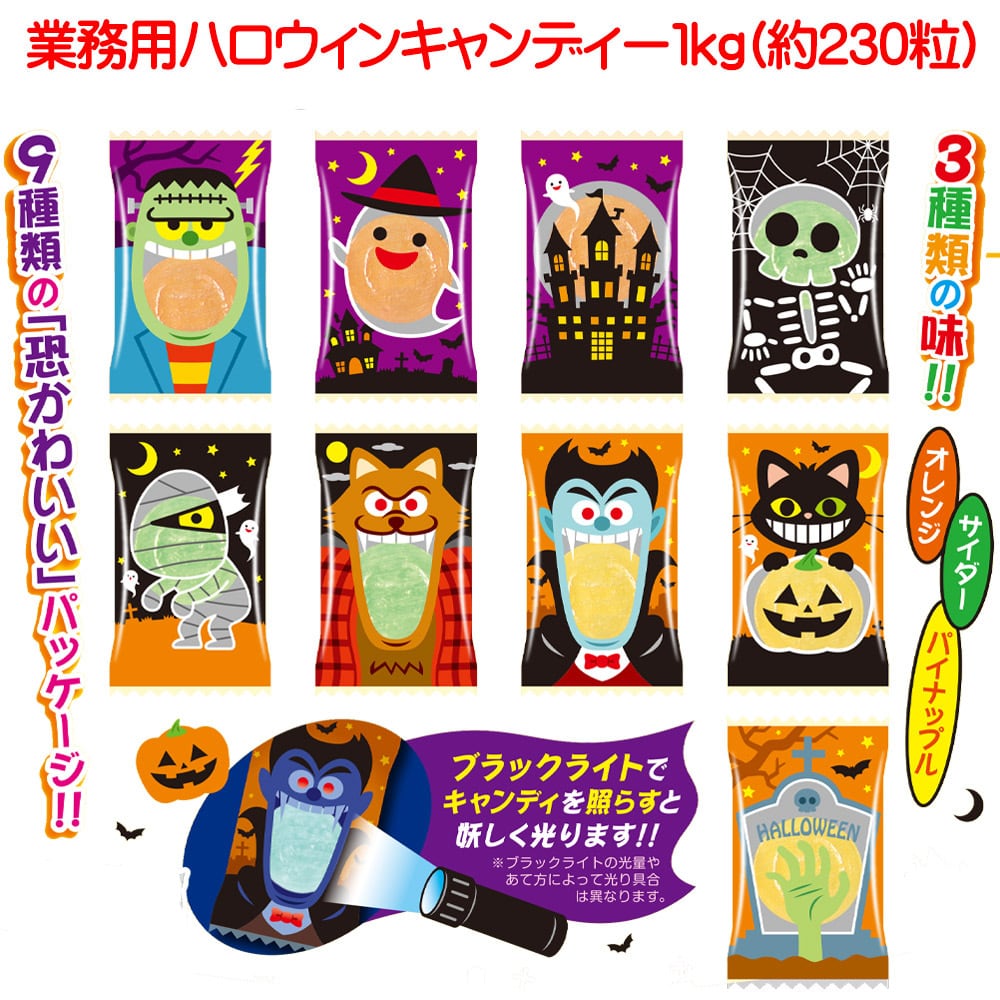 ハッピーハロウィンキャンディ:ブルーライトを当てると光る!?オレンジ味、サイダー味、パイナップル味の3種の味のアソートです。個包装になっており、1袋に30g(7個)ずつ入っています。賞味期限は製造から200日です。(※ブラックライトの当て方で光り方が変わります。)