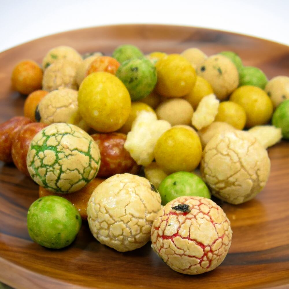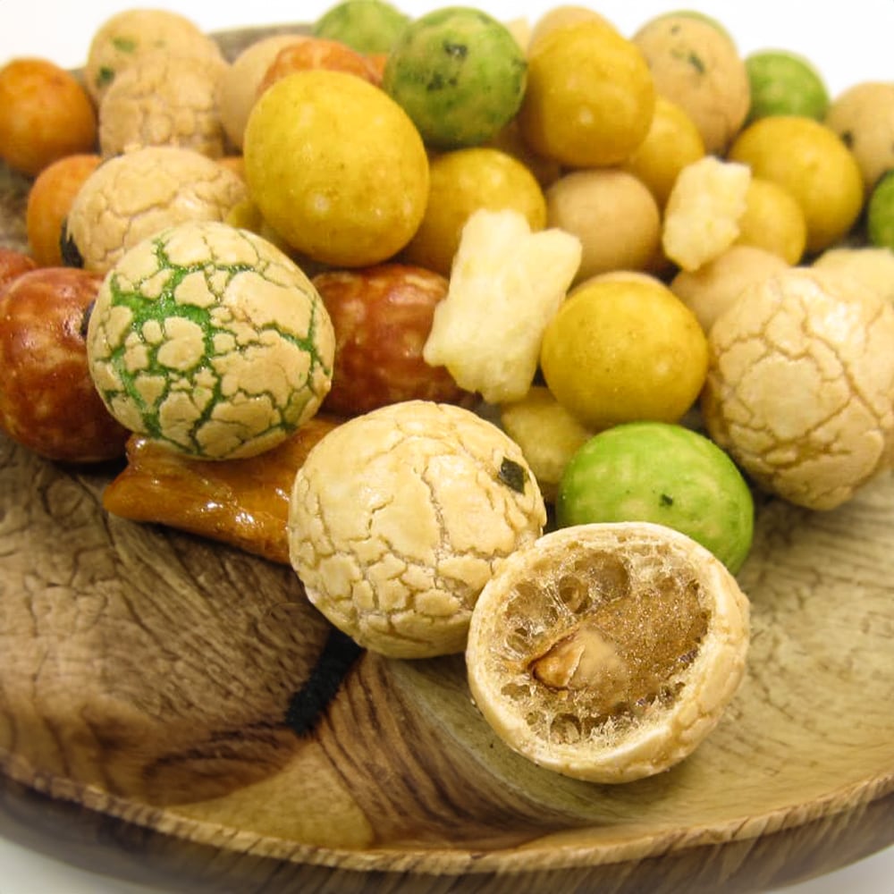 落花生、そら豆、グリンピースを餅粉や小麦のおかきでくんで焼いた、食べ応えのある昔ながらのお菓子です。あおさ、きざみのり、えび、カレー、ごま、しょうゆと様々な味を、ご家族 皆さまで楽しんで頂ける お菓子 です。