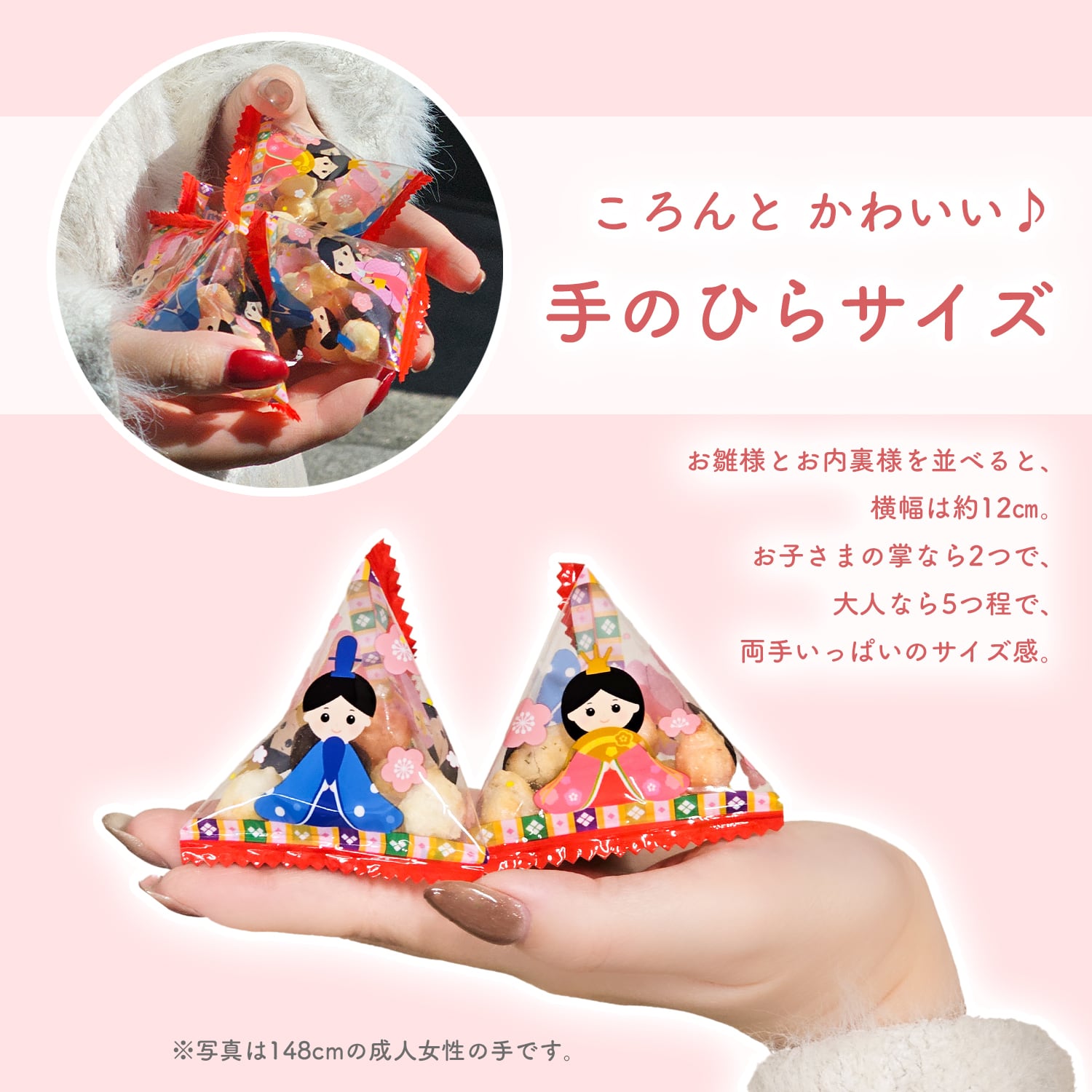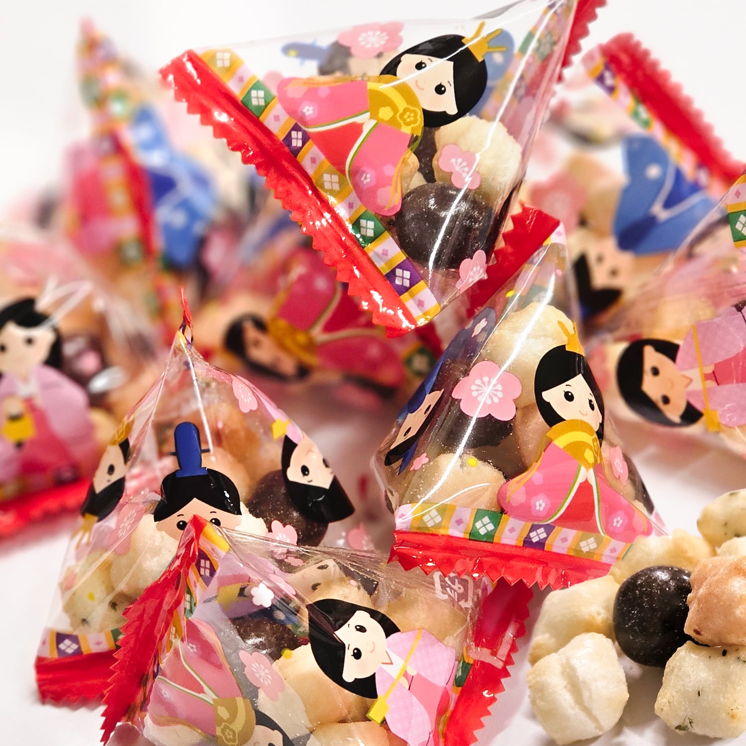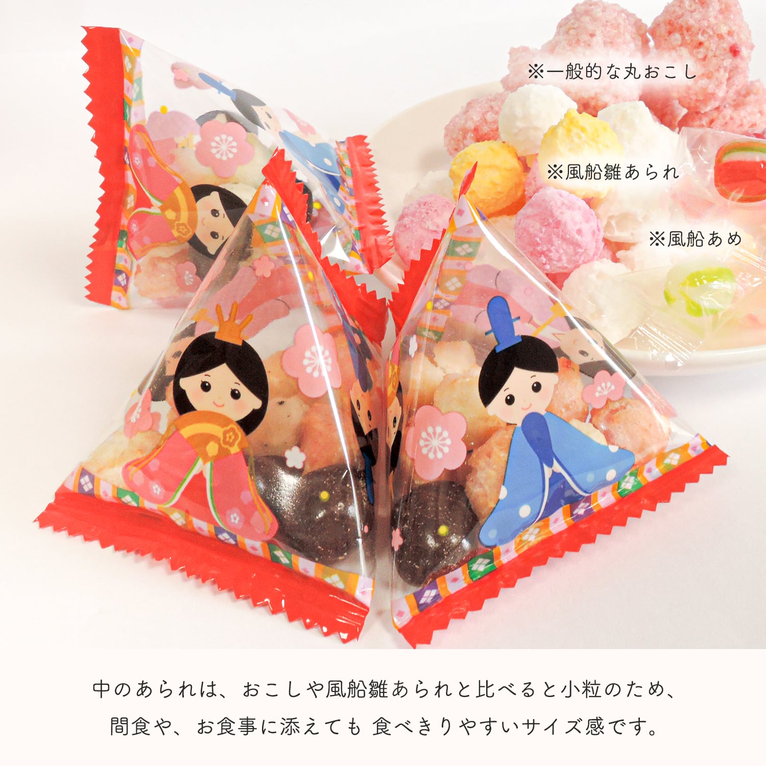 可愛い ひな祭り デザイン の 三角形 の パック に入った 美味しい ひなあられ です。