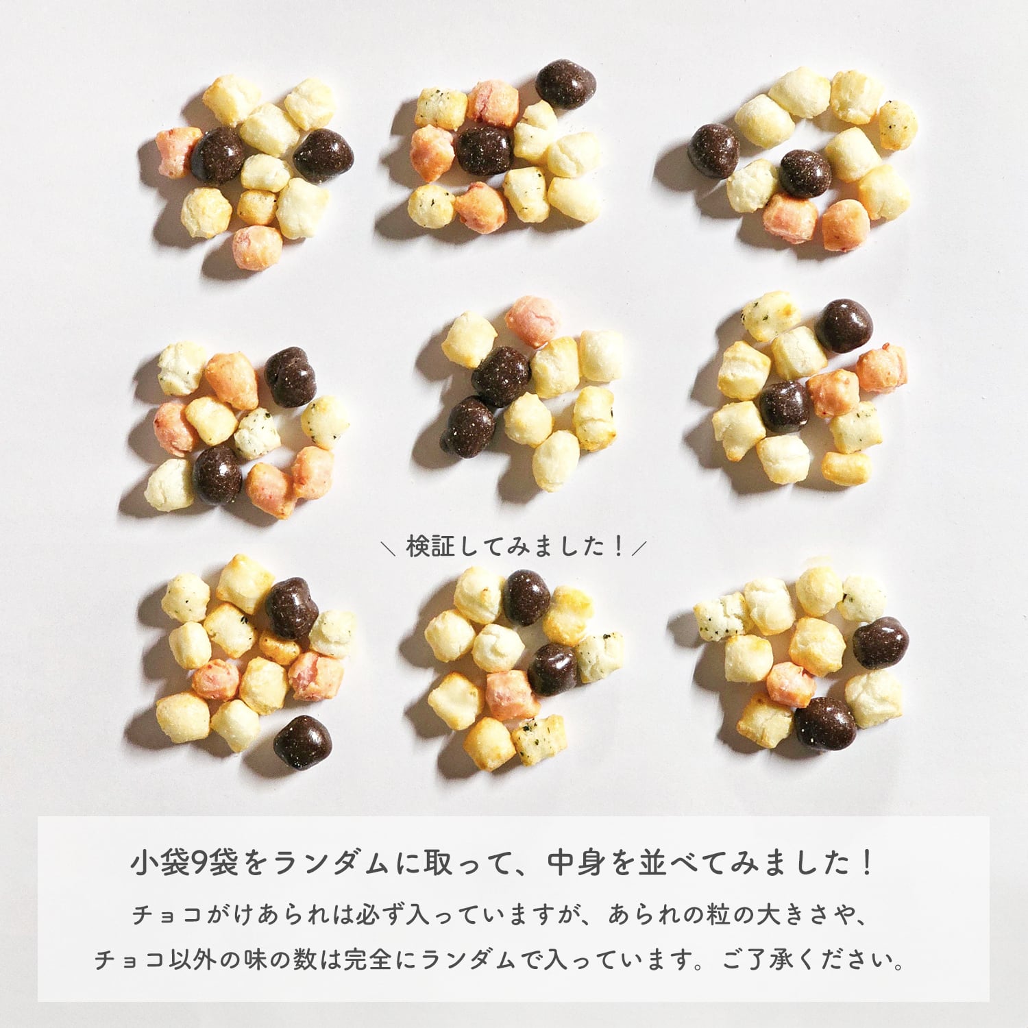 原材料:もち米(国産)、砂糖(国内製造)、カカオマス、全粉乳、醤油、食塩、えび、青さ、植物油、ココアバター、水飴/光沢剤、乳化剤、香料、調味料(アミノ酸等)、紅麹色素、(一部に乳成分・小麦・えび・大豆を含む)